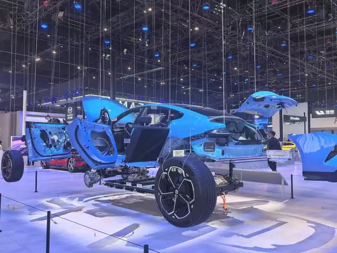 这可不是简单的展示。从现场图片来看,车辆的结构被多层次、多角度地呈现出来,仿佛一份立体的工程图纸。车身覆盖件被移除,核心的底盘架构、电池包布局、电机与悬挂系统的连接方式,都毫无保留地暴露在观众眼前。