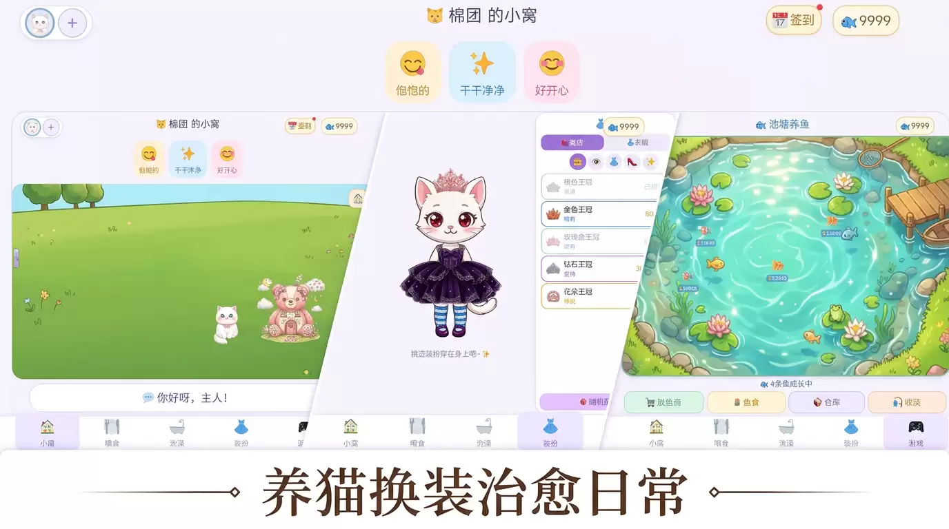 持续成长体验:每日签到领取奖励,猫窝也能随着游戏进程不断升级、焕然一新,为猫咪提供一个更舒适的家。