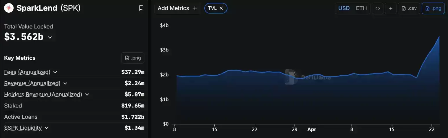 然而,潮水退去时,有些礁石反而浮得更高。Spark协议的TVL曲线在4月19日午后陡然上扬,一条近乎垂直的绿线刺穿了图表——从19亿到34亿,中间几乎没有缓冲,只有连续不断的链上转账记录:孙宇晨的钱&包向Spark存入12,000枚ETH;某匿名地址将3.2亿USDT从币安提至Spark Sa vings;另一笔8700万美元的稳定币在短短17分钟内完成了跨链与存入。