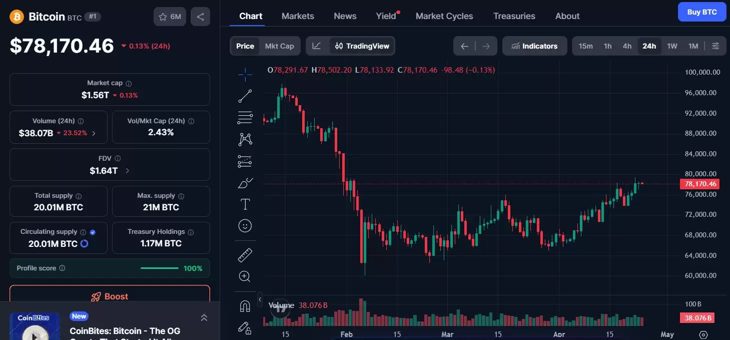 比特币(BTC)今日价格报78,170.46美元,24小时微涨0.13%。其交易量高达380亿美元,市值维持在1.56万亿美元。这种“价平量稳”的态势,通常意味着多空双方在当前位置达成了短暂平衡。