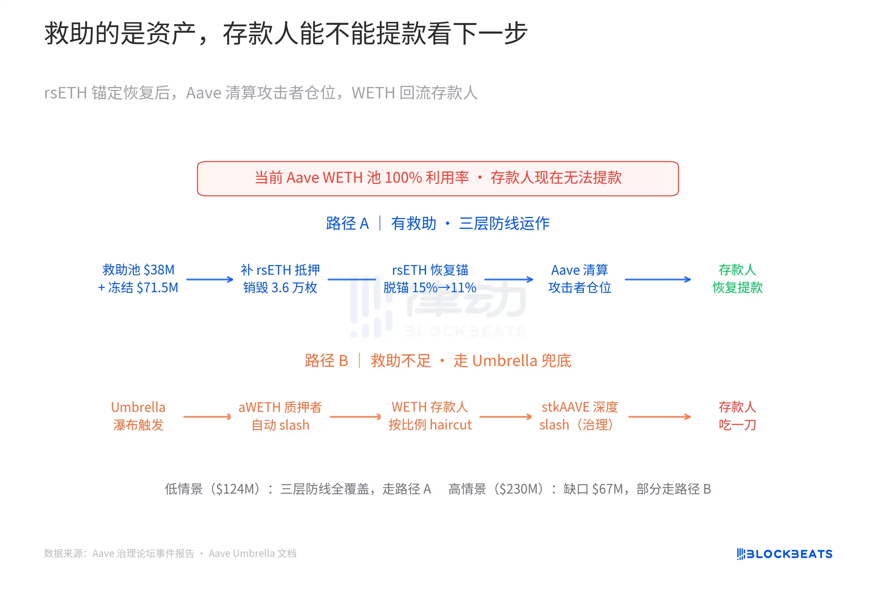 如果最终走向隔离路线,局面则会变得分裂。Ethereum Core市场完全无损,主网存款人不受影响。但同时,Umbrella保险也不会被触发,因为其覆盖范围仅限于Ethereum Core市场。真正需要承担2.30亿美元损失的,是Mantle和Arbitrum上的WETH存款人。他们能指望的,只有Arbitrum追回的7,150万美元,加上「DeFi United」的3,840万外部注资,合计约1.09亿美元。