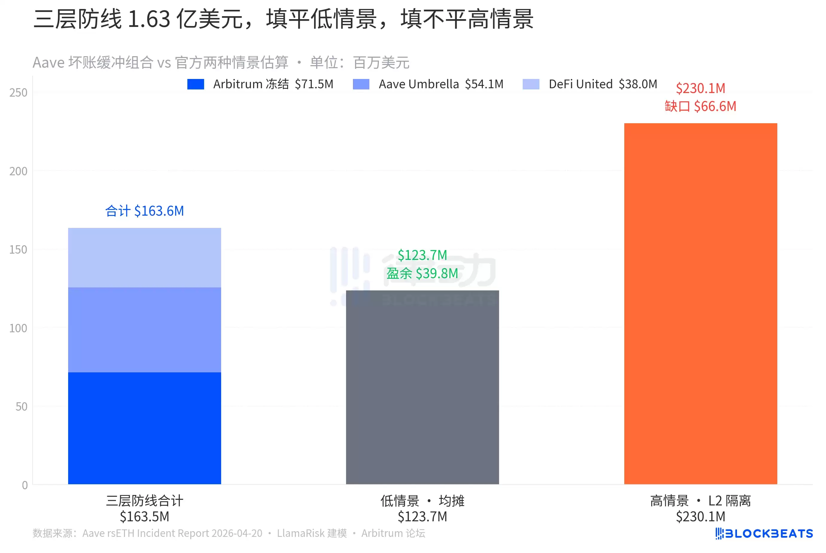 现在,让我们把这三层防线加起来看看:联合救助的3,840万美元、Arbitrum追回的7,150万美元,再加上Aa ve自身的5,406万美元保险储备,总额达到约1.63亿美元。对比Aa ve给出的低情景坏账1.24亿,这个数字不仅能够填平缺口,还多出近4,000万美元的富余。然而,如果面对高情景的2.30亿美元坏账,资金缺口仍然高达6,660万美元。