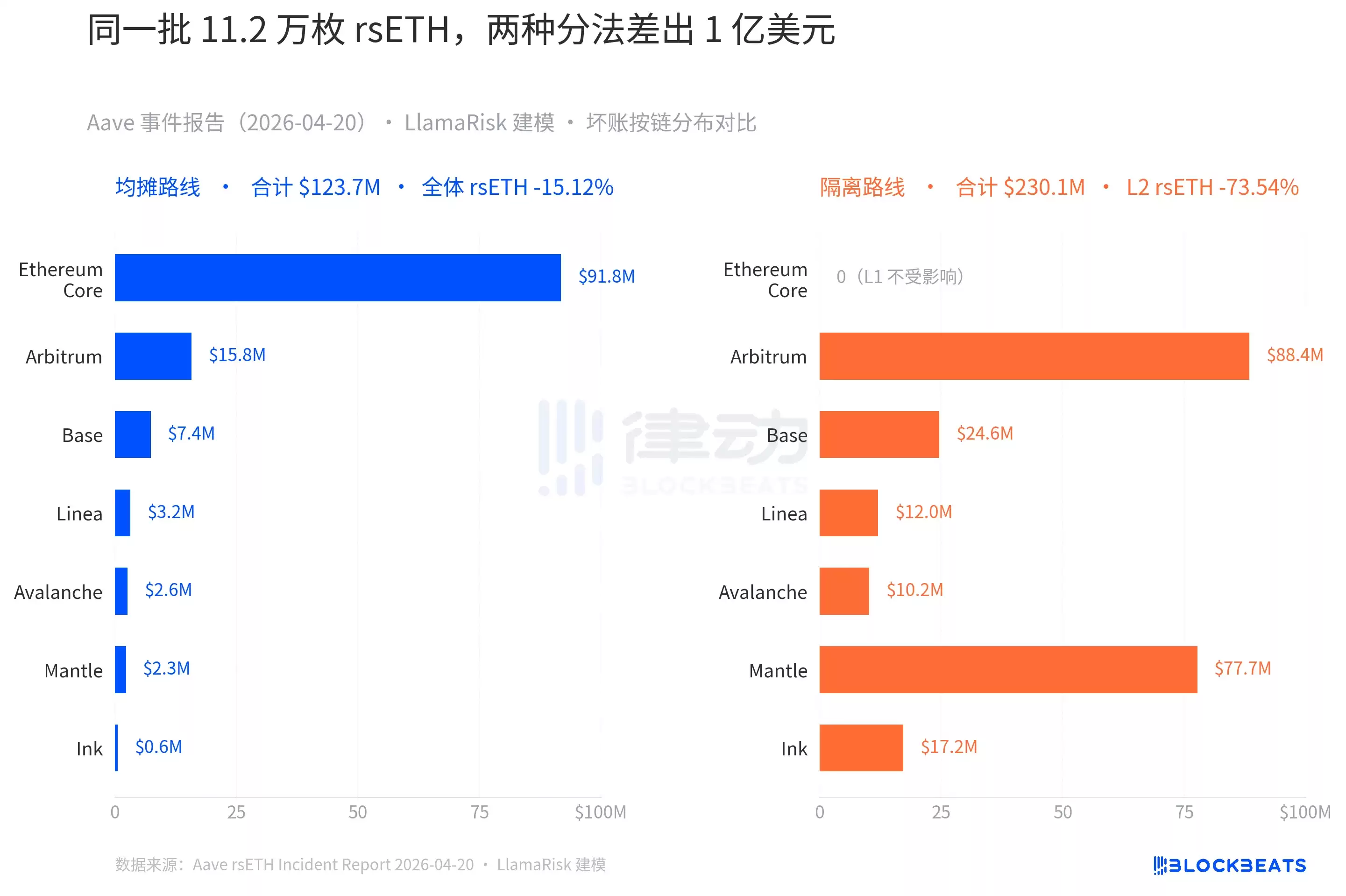 两条路线下相差的1.06亿美元,本质上是「代价由谁承担」的转移。选择均摊,意味着Ethereum Core的存款人需要共同承受9,180万美元的损失。选择隔离,则能完全保住主网存款人,但代价是Mantle和Arbitrum两条L2上的WETH存款人将承担大部分冲击。