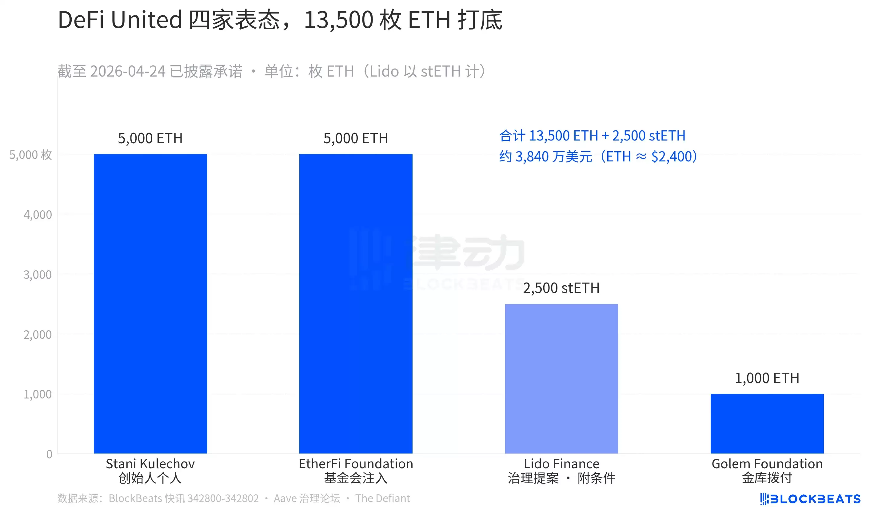 再加上Aa ve创始人Stani Kulechov以个人身份承诺的5,000枚ETH,这场自称「DeFi United」的联合行动,已披露的出资规模定格在1.35万枚ETH外加2,500枚stETH。一场行业自救的序幕,就此拉开。