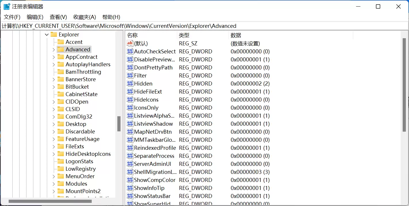 接下来,我们需要在注册表编辑器的左侧目录树中,依次展开并定位到以下路径:HKEY_CURRENT_USER\Software\Microsoft\ Windows\CurrentVersion\Explorer\Advanced。请务必确保路径准确无误。