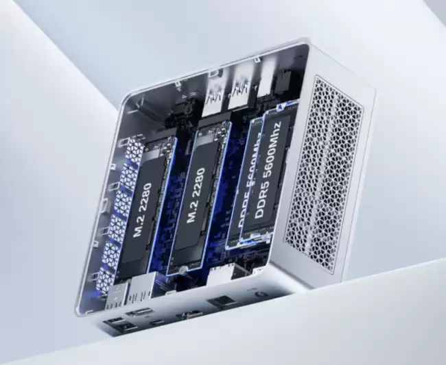 性能核心自然是那颗英特尔酷睿 Ultra 5 125U处理器,基于Meteor Lake U架构,拥有12核心14线程。扩展性方面,它提供了2个DDR5-5600 SO-DIMM内存插槽和2个M.2 2280 PCIe Gen4 SSD盘位,给用户留下了充足的升级空间。网络连接则由英特尔I226-V 2.5Gb有线网卡和支持Wi-Fi 6E与蓝牙5.2的无线网卡负责。