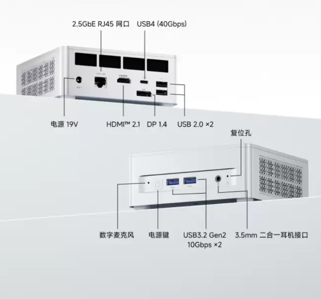 接口的丰富程度,往往是迷你主机实用性的关键。这款机型的前面板配备了2个USB-A 10Gbps接口和一个3.5mm音频插孔。真正的接口“大本营”则在机身背面:一个全功能USB-C 40Gbps接口(支持100W PD输入和15W输出)、2个USB-A 480Mbps接口、一个HDMI 2.1 TMDS接口、一个DisplayPort 1.4接口,以及一个2.5GbE RJ45网口。这样的配置,应对日常多屏办公和高速数据传输需求,基本没有压力。
