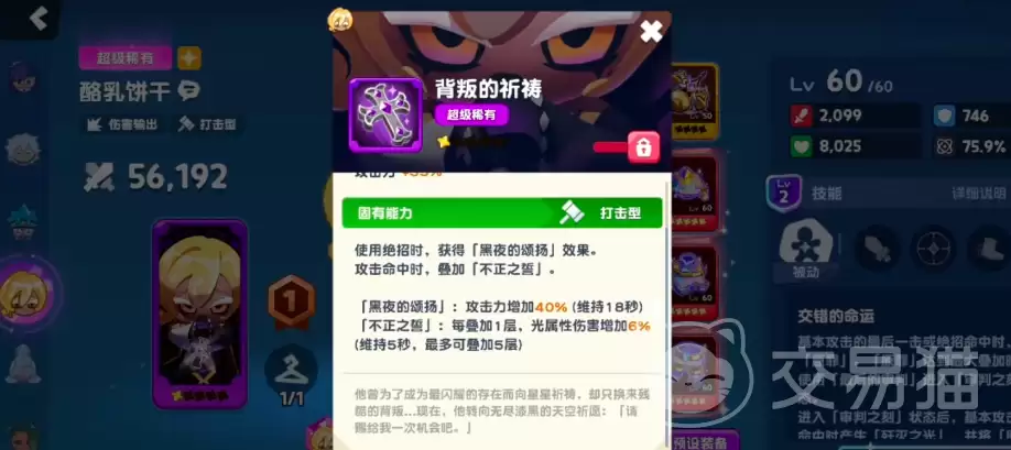 酪乳饼干的核心机制,围绕着一套精妙的双重动态增益展开。其主动技能“背叛的祈祷”能直接提供35%的基础攻击力加成,这已经是个不错的开局。但关键还在后面:技能会同时触发被动状态“黑夜的颂扬”,让攻击力再提升40%,持续整整18秒。