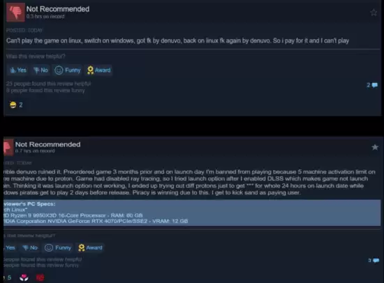 社区里充满了 frustration。一位预购了数月的玩家在评测中愤怒地写道,自己在发售当天为了能让游戏流畅运行而不断尝试各种设置组合,结果换来的却是整整24小时的游戏锁定。更讽刺的是,有消息指出,游戏甚至在正式发售前几天就已经被破解并可完整运行。这怎能不让人心生寒意?