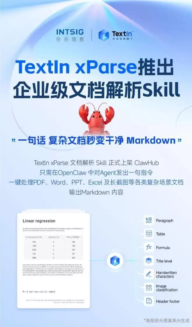 大模型技术正大步迈向“自主执行”的新阶段,以“龙虾”(即“OpenClaw”)为代表的智能体应用,无疑成了当下AI圈的热门话题。构建一个能干的智能体,光有“大脑”还不够,它得会调用外部专业能力——这就引出了智能体搭建中的关键要素:Skill。然而,当开发者试图将Skill部署到真实的企业业务流中时,一个普遍的痛点便浮出水面:文档解析能力跟不上。大量Skill正是因为“读不懂”复杂的业务文档,而难以稳定、可靠地运行。