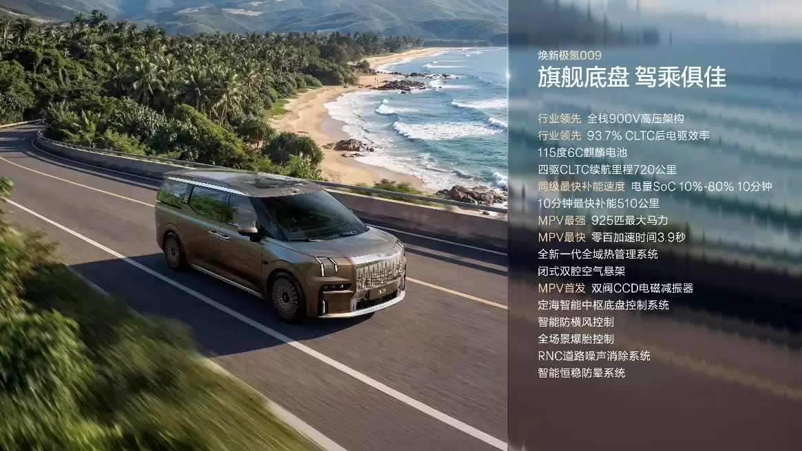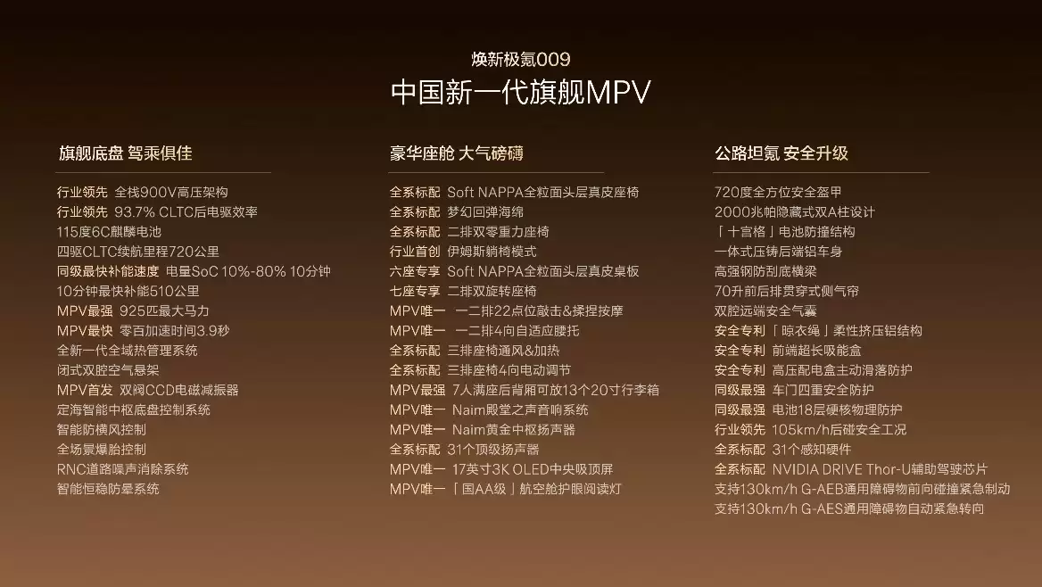 那么,在产品力上,焕新极氪009究竟带来了哪些实质性的跃升?答案可以从豪华、性能、安全这三大维度来寻找。