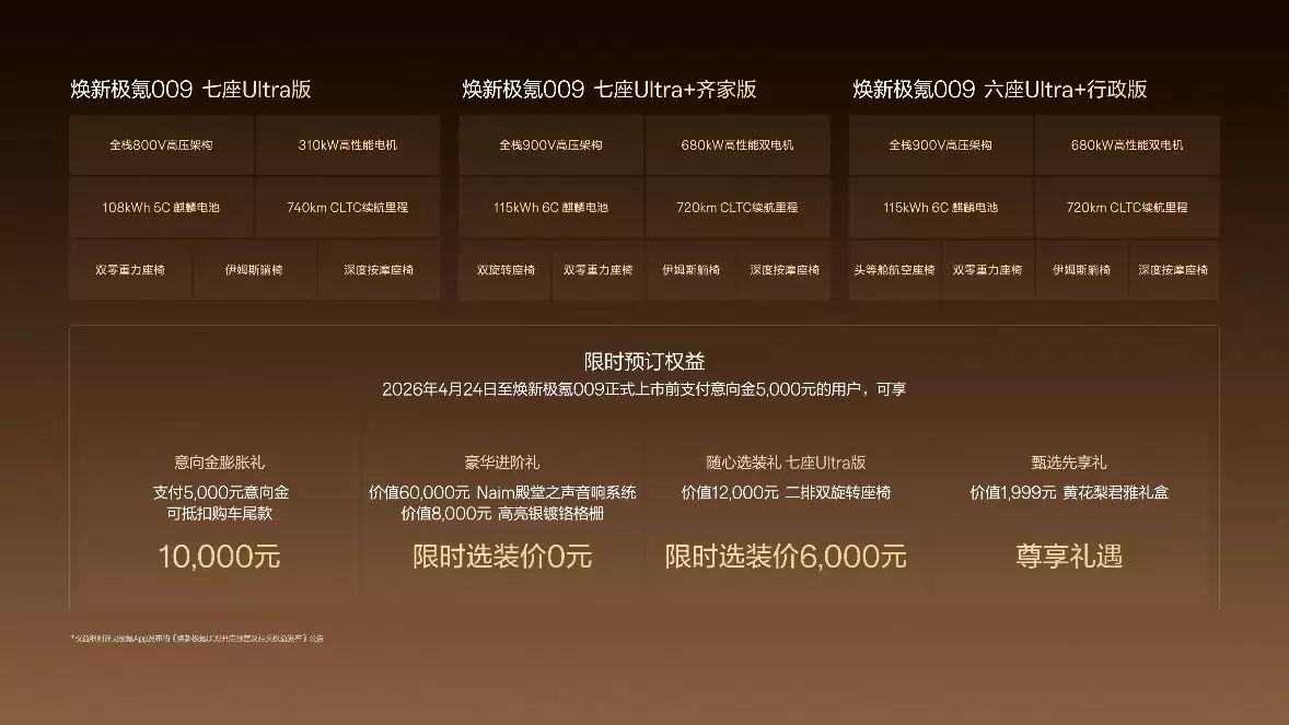 新车阵容清晰,共推出三款配置:七座 Ultra版、七座 Ultra+齐家版和六座 Ultra+行政版。预售权益颇具诚意,限时至高可享价值8万元的礼遇。具体来看:预付5000元意向金,尾款可直接抵扣10000元;预售期内,可免费选装价值60000元的Naim殿堂之声音响系统以及8000元的高亮银镀铬格栅。对于七座Ultra版用户,还能以6000元的预售特惠价,选装原价12000元的二排双旋转座椅。此外,还附赠价值1999元的极氪专属黄花梨君雅礼盒。