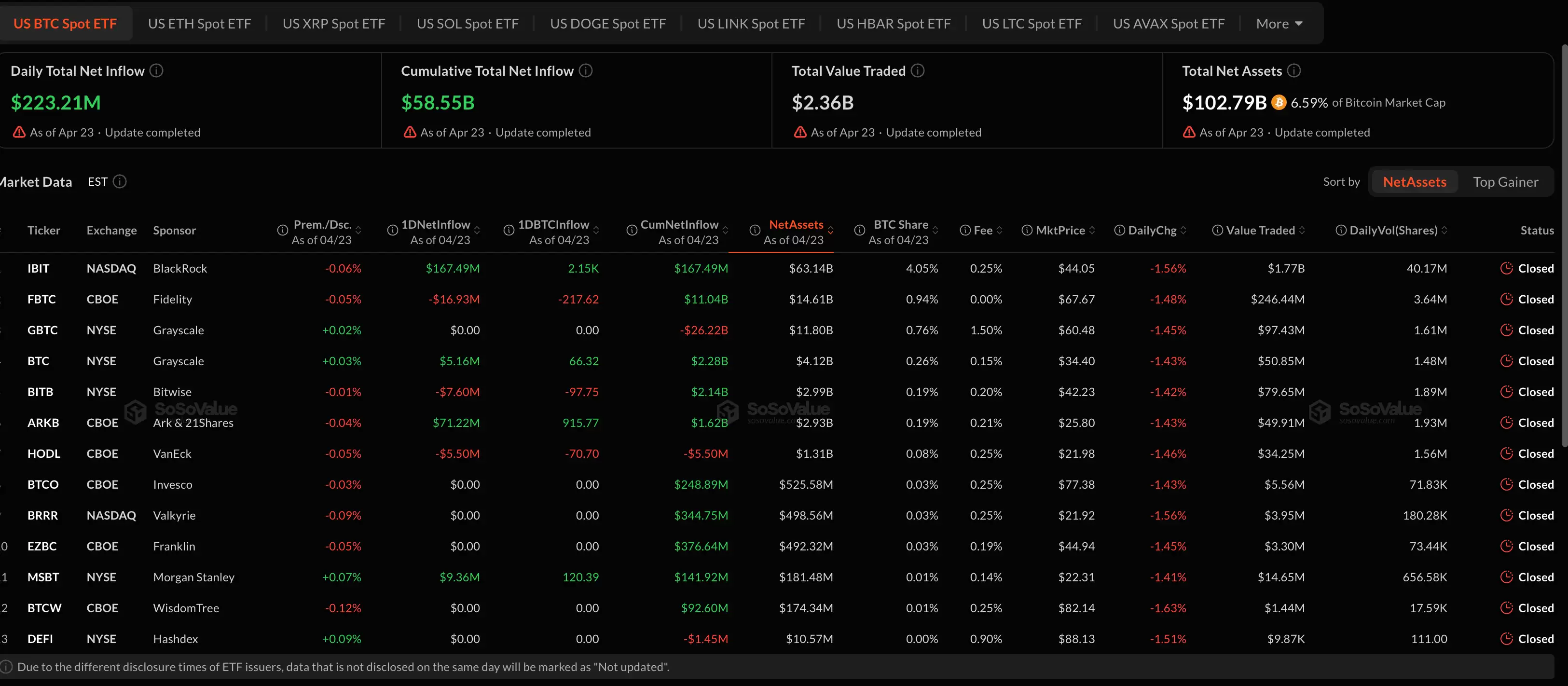 截至4月23日,美国现货比特币ETF已经连续八个交易日“吸金”,总流入额高达21亿美元。根据SoSoValue的数据,这是自去年10月比特币连续九天飙升至12.6万美元历史高点以来,最长的一次资金流入纪录。单看4月23日这一天,比特币ETF就流入了2.2321亿美元。其中,贝莱德旗下的IBIT几乎扛起了大旗,贡献了约75%的资金,流入1.6749亿美元。相比之下,富达的FBTC成了当天唯一一笔显著的资金流出,流出了1693万美元。