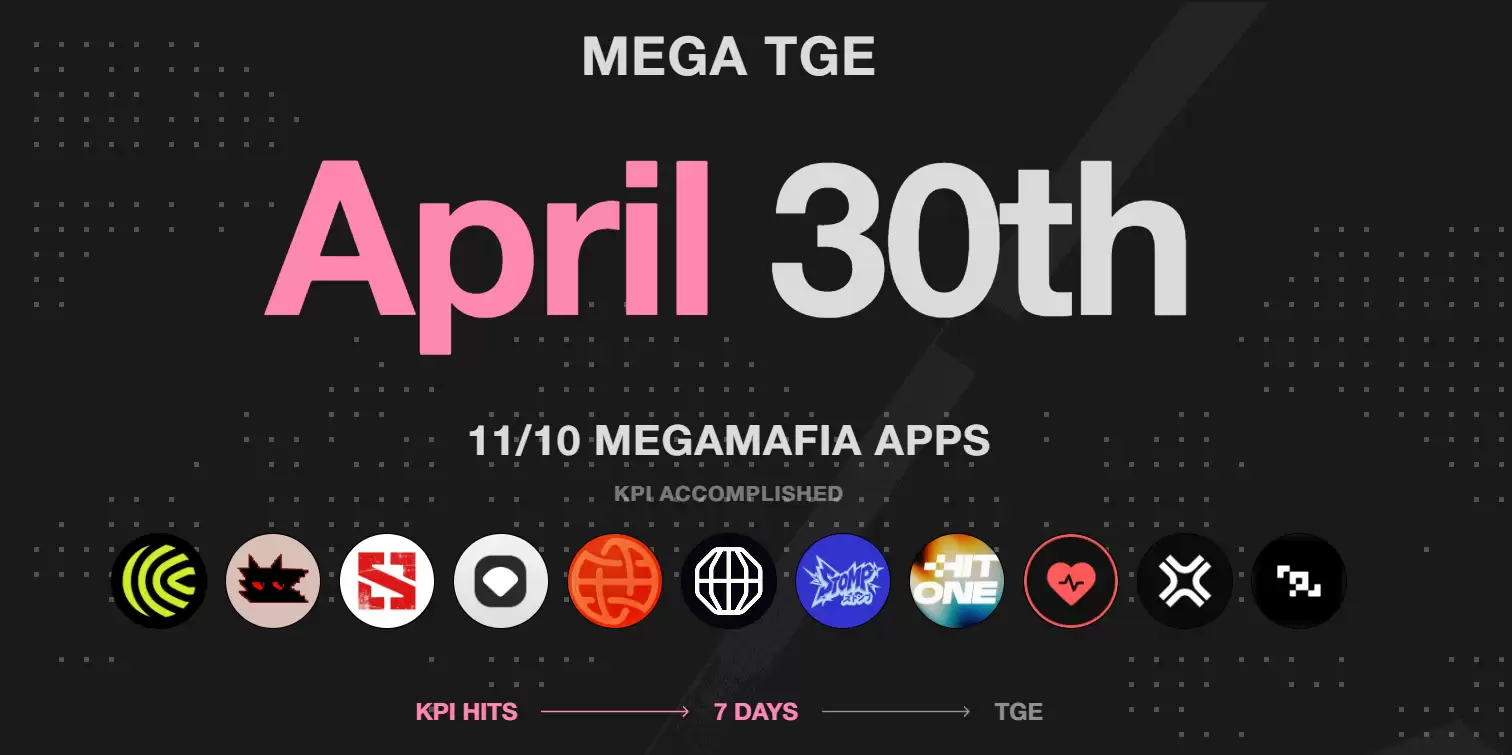 MegaETH设定的首个关键绩效指标(KPI),在10个MegaMafia应用上线并达到基准用户活跃度后,正式宣告完成。翻看其代币常见问题解答,你会发现,三个KPI中的任何一个达成,都能触发上线流程。而一旦触发,为期七天的倒计时便将启动。所谓Megaeth代币生成活动(TGE),指的就是代币被正式创建和发布的时刻。官方的X公告将这一时刻定格在了2026年4月30日。