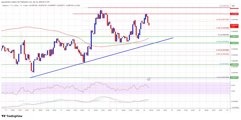 狗狗币的走势,似乎又回到了熟悉的剧本里。在尝试冲击0.0985美元未果后,价格如期开始回调。这一波调整,不仅跌破了0.0980美元,连0.0970美元的关口也没能守住。