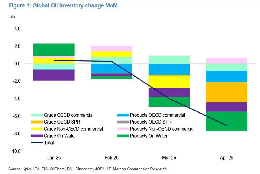 这是本轮供需失衡中最清晰的实时警报。摩根大通估算,可观测的商业及战略库存在3月去库400万桶/日,4月激增至710万桶/日。同时需要警惕的是,由于部分成品油库存可见度有限,实际的去库幅度完全可能显著大于已报告的数据。