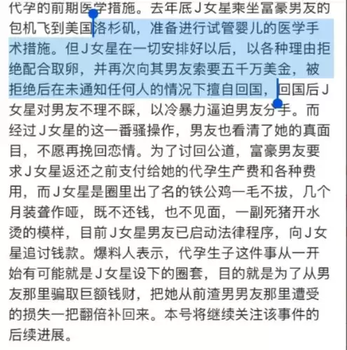 故事的精彩处在于后续发展。爆料称,尽管对外一直维持单身状态,但她早已与一位富豪男友展开地下恋情。双方感情稳定后,女星主动提出了赴美代孕生子的计划,富豪男友欣然同意,并迅速转账巨额费用以表支持。两人随后一同飞往洛杉矶,完成了相关的医学准备。