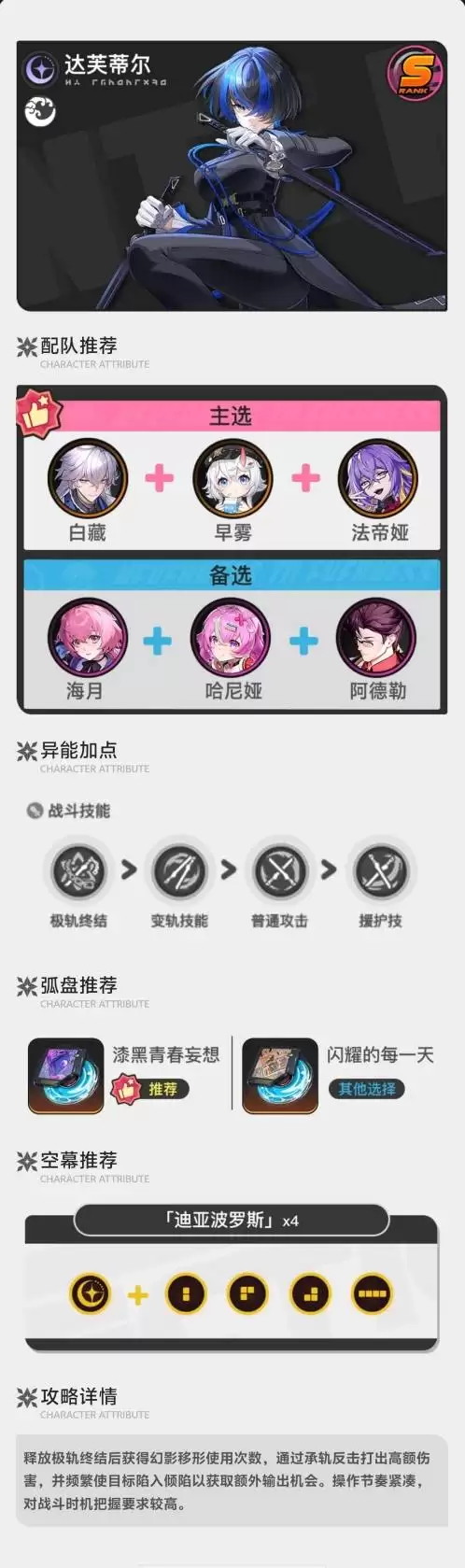 总的来说,培养达芙蒂尔是一条明确的道路:堆高双暴与攻击面板,用合适的遗器套装放大她的输出特性,再为她搭配能提供保护与增伤的队友。当这些条件齐备时,这位伊波恩古董店的输出专家,定能在你的队伍中展现出令人惊艳的破坏力。