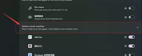 2. 在打开的设置页面中,向下滚动,你会找到一个名为“任务栏角溢出”的选项(英文界面通常显示为“taskbar corner overflow”)。点击进入。