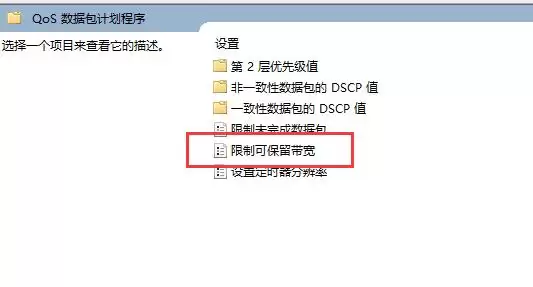 5. 在“QoS数据包计划程序”的设置项里,找到最关键的那个策略——“限制可保留带宽”。没错,就是它默认“扣留”了一部分带宽。直接双击打开它进行配置。