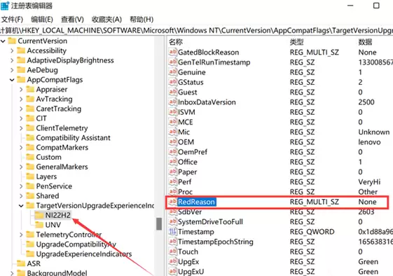 关键点来了:选中“NI22H2”,查看右侧名为“RedReason”的项。如果它的数值显示为“NONE”,那么恭喜你,这意味着微软没有为你的设备设置升级障碍,等更新推送时,你的电脑大概率能顺利升级到Win11 22H2。如果显示的是其他任何值,那就可能意味着升级之路会遇到阻碍。