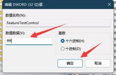 5. 双击“FeatureTestControl”,将其数值数据从默认值修改为 ffff(十六进制),点击“确定”保存。完成修改后,重启你的电脑。再次进入系统,尝试调整亮度,看看控制是否已经恢复。