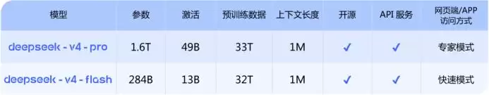 DeepSeek-V4分为Pro与Flash两个版本,均支持百万(1M)token超长上下文,总参数规模分别达到1.6T(激活49B)与284B(激活13B)。