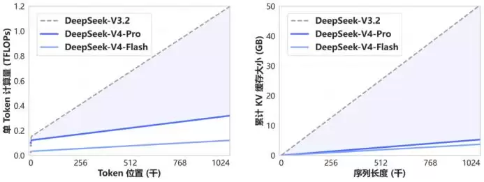 根据HuggingFace上V4系列的介绍,在100万token上下文场景下,V4-Pro的单token推理FLOPs只有V3.2的27%,KVcache只有V3.2的10%。