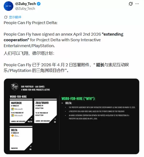 游戏行业又有新动态了。根据海外知名爆料人Zuby_Tech的消息,《先驱者》的开发商People Can Fly,已经在2026年4月2日签署了一份合作附件,将他们与索尼互动娱乐就代号“Project Delta”项目的合作周期正式延长了。