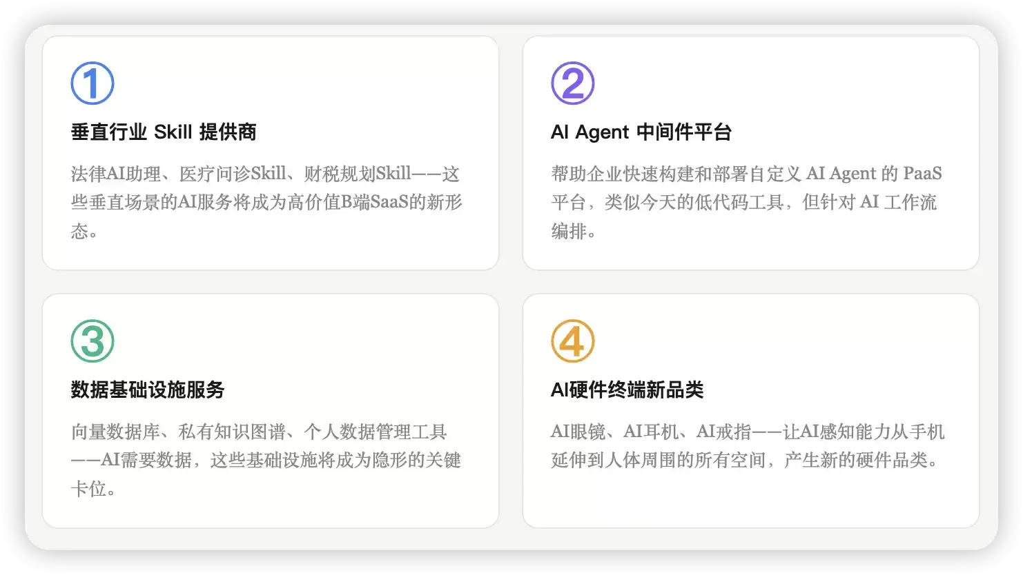 对于独立创业者来说,Claw时代反而可能意味着机会——因为开发一个高质量的垂直AI Skill,其成本远低于构建一个完整的App生态。找准一个真正理解的垂直领域,用AI将专业能力产品化,是这个时代极具潜力的创业方向之一。