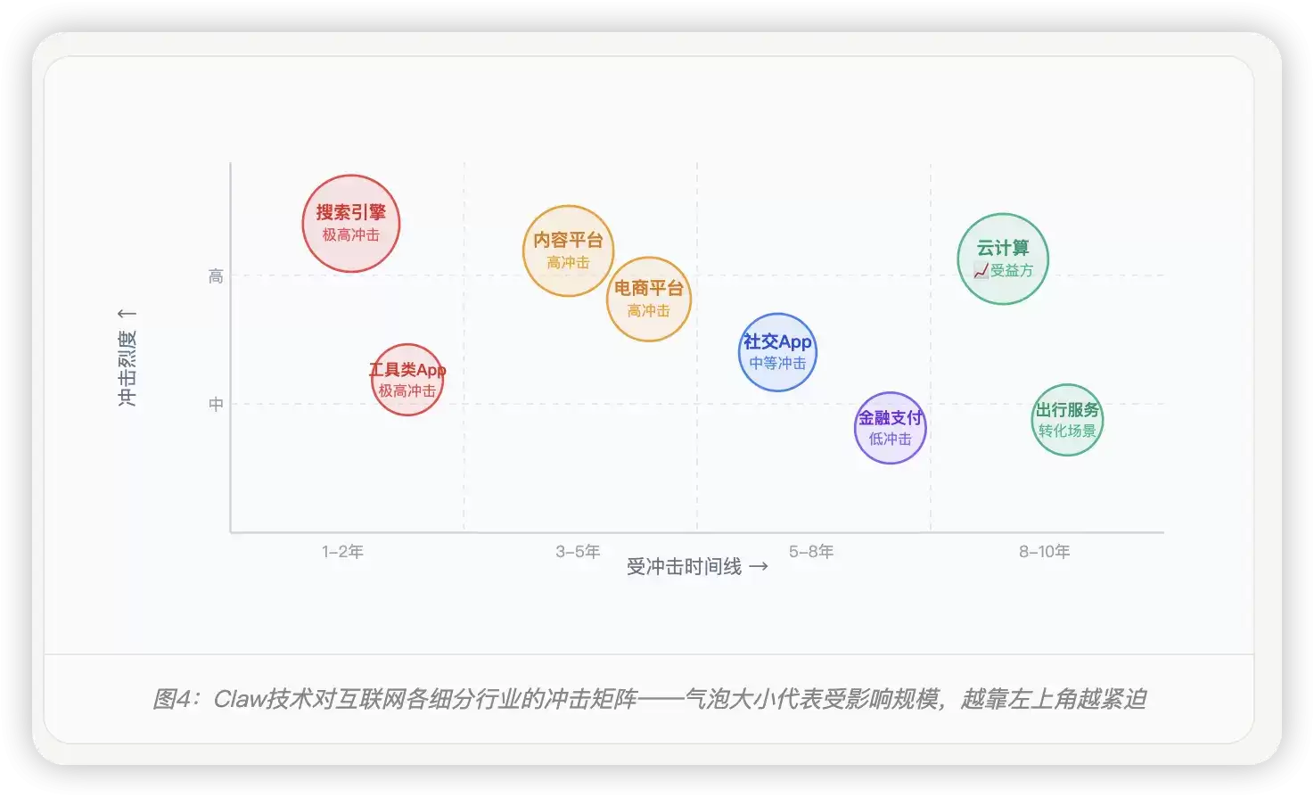 图4:Claw技术对互联网各细分行业的冲击矩阵——气泡大小代表受影响规模,越靠左上角越紧迫