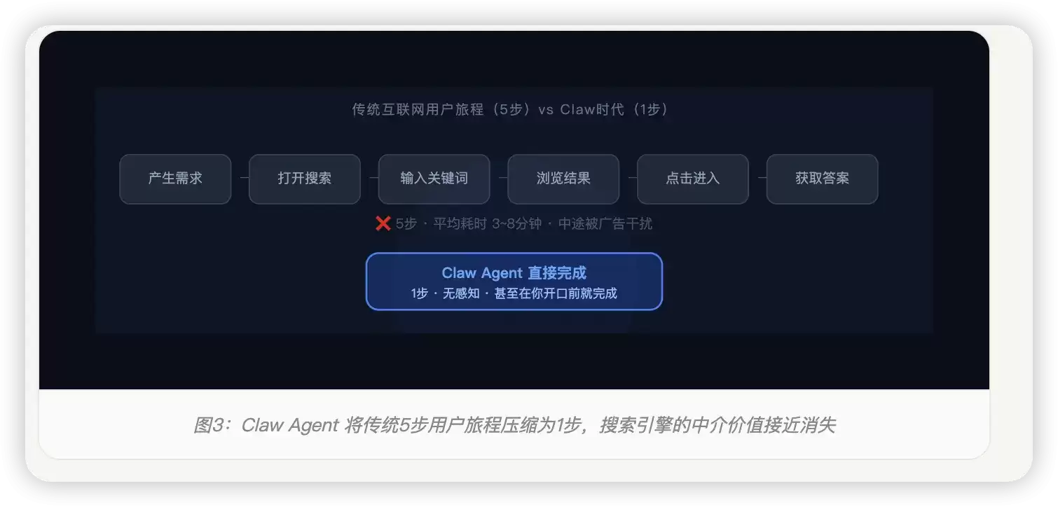 图3:Claw Agent 将传统5步用户旅程压缩为1步,搜索引擎的中介价值接近消失