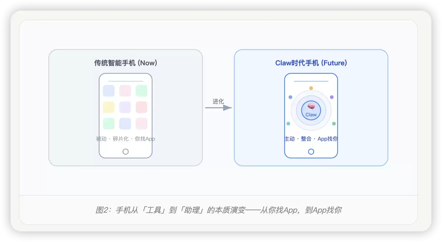 图2:手机从「工具」到「助理」的本质演变——从你找App,到App找你