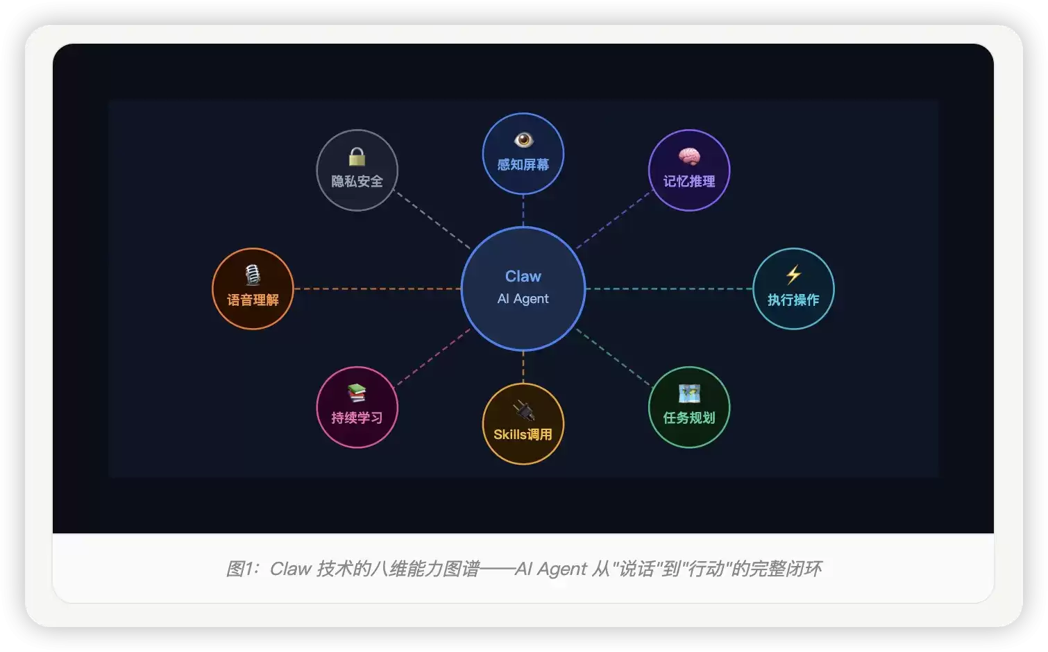 图1:Claw 技术的八维能力图谱——AI Agent 从“说话”到“行动”的完整闭环