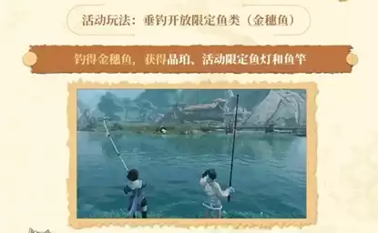 偏好休闲玩法的玩家,【鱼跃金溪】是不二之选。拿起鱼竿,在溪边享受片刻宁静,目标是钓起本次庆典的限定鱼类“金穗鱼”。成功钓到,不仅能获得晶珀,还有活动限定的鱼灯和鱼竿作为收藏。
