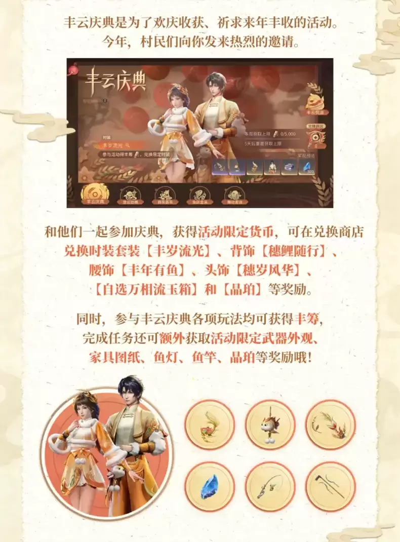 整个庆典由五大板块活动组成:【登云拾穗】、【群英荟萃】、【鱼跃金溪】、【舞动麦浪】以及【丰云悦游】。这可不是简单的“五选一”,而是每一部分都对应着独特的玩法和限定奖励,想要拿全奖励,一个都不能少。