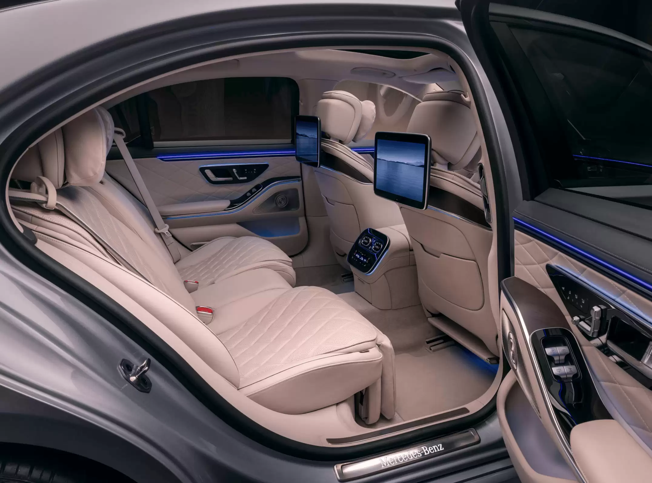 拉开车门,扑面而来的是一种被科技重新定义的奢华。目之所及,是大量高级诗米安材质的铺陈,精致的刺绣与无处不在的三叉星辉徽标,无声地诉说着车主的品位。而科技感则主要由多块屏幕承载:中控是一块14.4英寸的触控屏,内置最新的MBUX智能人机交互系统;前方是12.3英寸的全液晶仪表,副驾驶前方同样有一块12.3英寸的娱乐屏。后排的享受更是被格外重视,双13.1英寸的高清显示屏,配合一个全新的可拆卸式独立触控遥控器,就能轻松掌控空调、遮阳帘和娱乐系统。