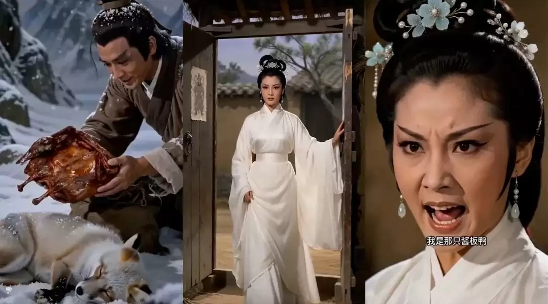 视频通常这样展开:多年后,一位身着古风服饰的神秘女子翩然而至,抛出那个经典问题:“你是否在雪山救过一只狐狸?”屏幕前的观众和视频中的男子一样,满心以为熟悉的报恩戏码即将上演。