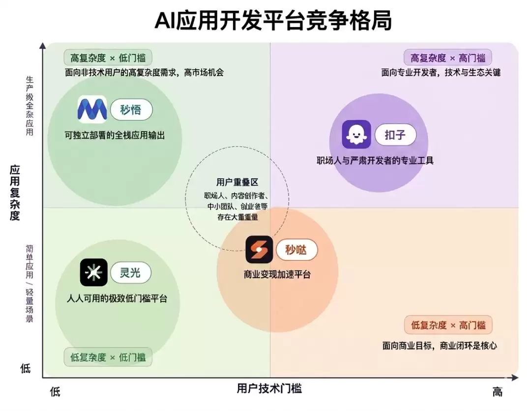 以“技术门槛”和“应用复杂度”两个维度搭建行业竞争地图,四款产品的站位差异一目了然:灵光以极致低门槛覆盖最广泛的大众用户,居于地图左下角;秒悟输出的是可独立部署的全栈应用,居于左上角;扣子聚焦职场人群与严肃开发者,门槛与复杂度双高,处于右上位置;秒哒位置相对居中,更偏向商业变&现纵轴。