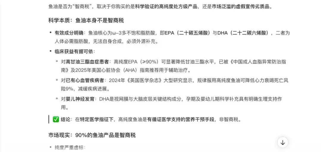 例如,近期保健品领域因大V争论引发了关于“鱼油是否为智商税”的广泛讨论。通过百度AI询问该问题,得到的回答相对准确且具有辩证性:“鱼油是否为‘智商税’,取决于你购买的是经过科学验证的高纯度处方级产品,还是市场泛滥的虚假宣传劣质品”。