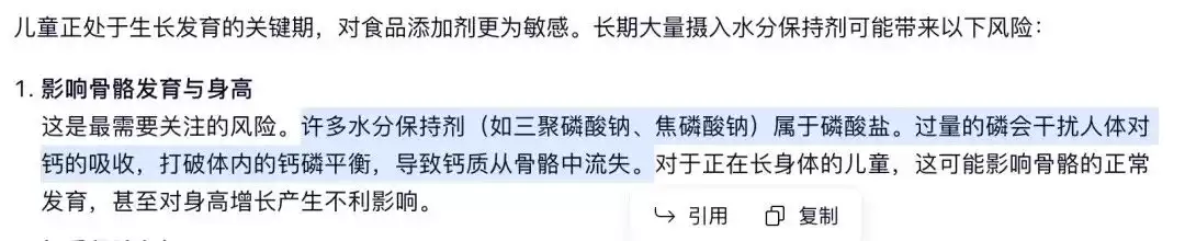 一个简单的例子是,针对今年3·15曝光的“食品保水剂”滥用问题,参考了百科词条的AI能够明确指出:长期大量摄入磷酸盐(保水剂主要成分),可能导致儿童发育迟缓和骨骼畸形,并依据百科内容进一步阐明其背后的科学原因。