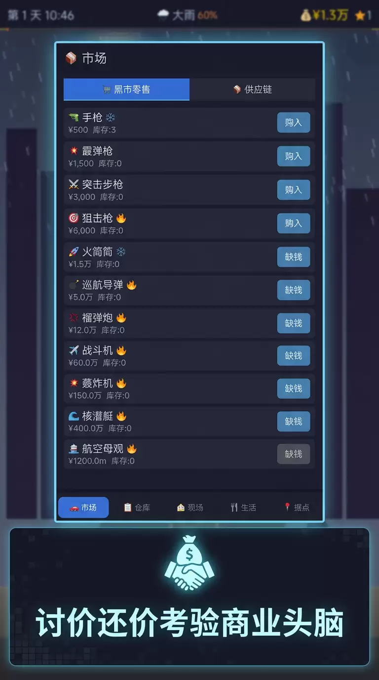 想象一下,亲手经营一个地下军火帝国是什么感觉?《军火贸易》的核心玩法正是如此。你需要精打细算,在波诡云谲的市场中低买高卖,与各路角色讨价还价。同时,升级你的秘密据点、招募得力干将也是壮大生意的关键。整个过程并非一帆风顺,市场价格的波动和警方的严密追查,构成了游戏的主要挑战。你的目标很明确:从街头暗巷的微小交易开始,步步为营,最终崛起成为掌控全局的终极军火大亨。