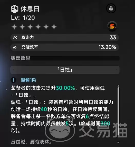 先看基础面板。“休息日”在Lv.1时提供33点攻击力和13.20%的充能效率,单看数字或许不算顶尖。但它的真正价值,藏在独特的机制里。激活其“日蚀”效果后,即使在混频1阶状态下,也能直接为角色带来30%的攻击力提升。这还没完,它搭载的专属调弧技能更为关键:主动开启一个持续40秒的日蚀领域,在此期间,每击杀一个敌人,就能恢复6点终结能量。