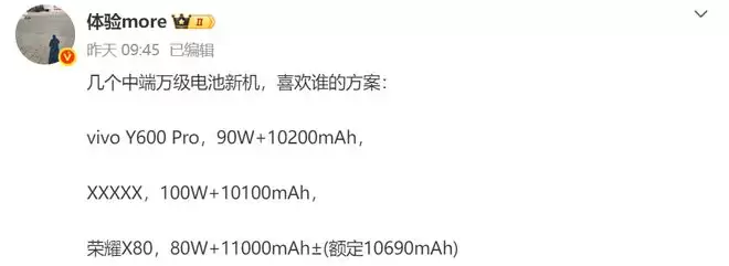 vivo Y600 Pro则卡位更低的入门区间,电池最大,但其他配置预计会相对保守,主打“续航一招鲜”。荣耀X80则是极限续航路线的代表,11000mAh几乎是将续航作为了第一且核心的卖点,其他维度只要不垫底便算成功。