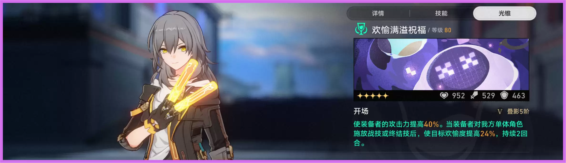 选择光锥时,需要紧密围绕欢愉主的两个核心功能:一是通过终结技为队友提供高额暴伤增益,二是稳定提升「欢愉度」以强化其行迹的转化收益。因此,光锥的适配性需从数值收益、循环效率与覆盖率三个维度综合考量。