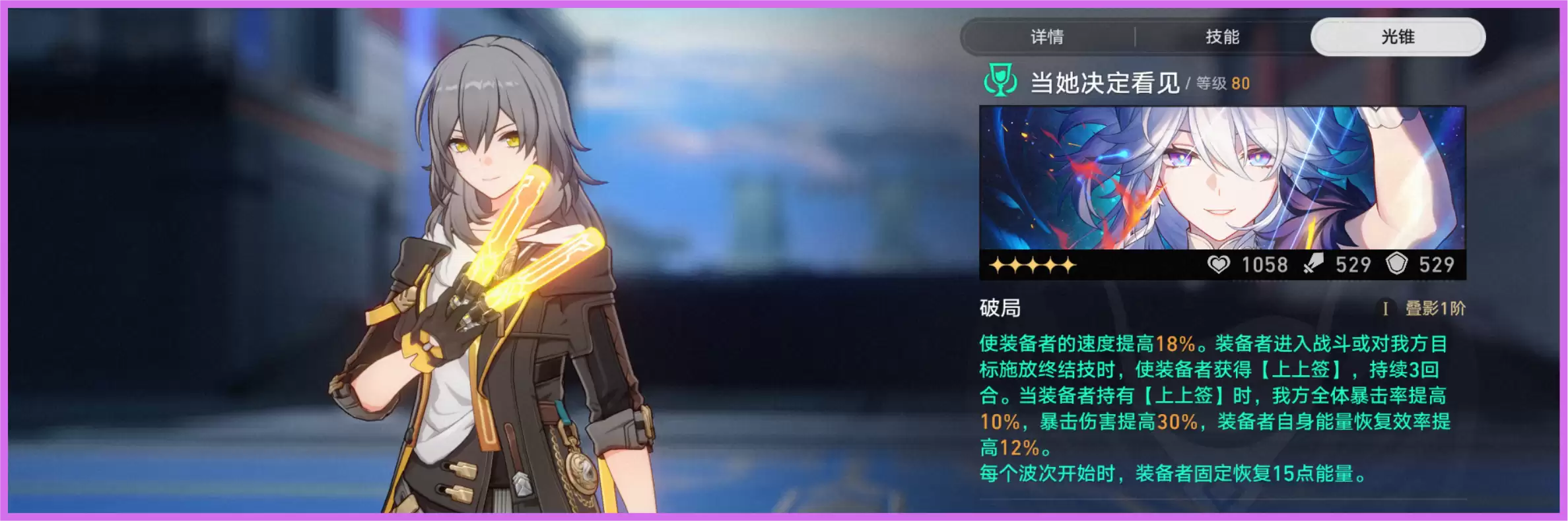 首先登场的,是堪称量身定制的「爻光」。它提供的18%速度加成,能有效优化欢愉主的行动顺序。而其核心效果在于:当我方目标施放终结技后,可为全体提供10%暴击率与30%暴击伤害的宝贵增益,同时自身回复12点能量。更关键的是,每个战斗波次还能固定恢复15点能量。这套组合拳下来,无论是从直接的暴击暴伤数值提升,还是从保障欢愉主自身“3动1大”的能量循环来看,契合度都达到了顶峰,无疑是优先级最高的选择。