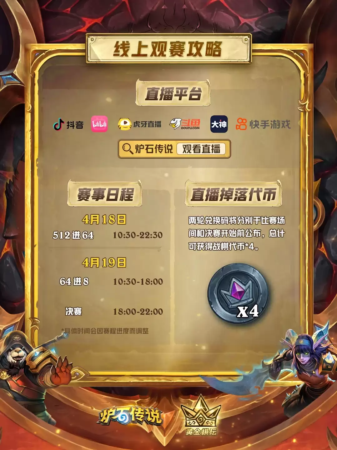 福利环节自然不能少。关注比赛进程,战棋代币将以兑换码形式,在比赛场间休息以及决赛开始前分批放出。记得锁定各大平台的《炉石传说》官方直播间,稳稳领取共计4枚战棋代币。