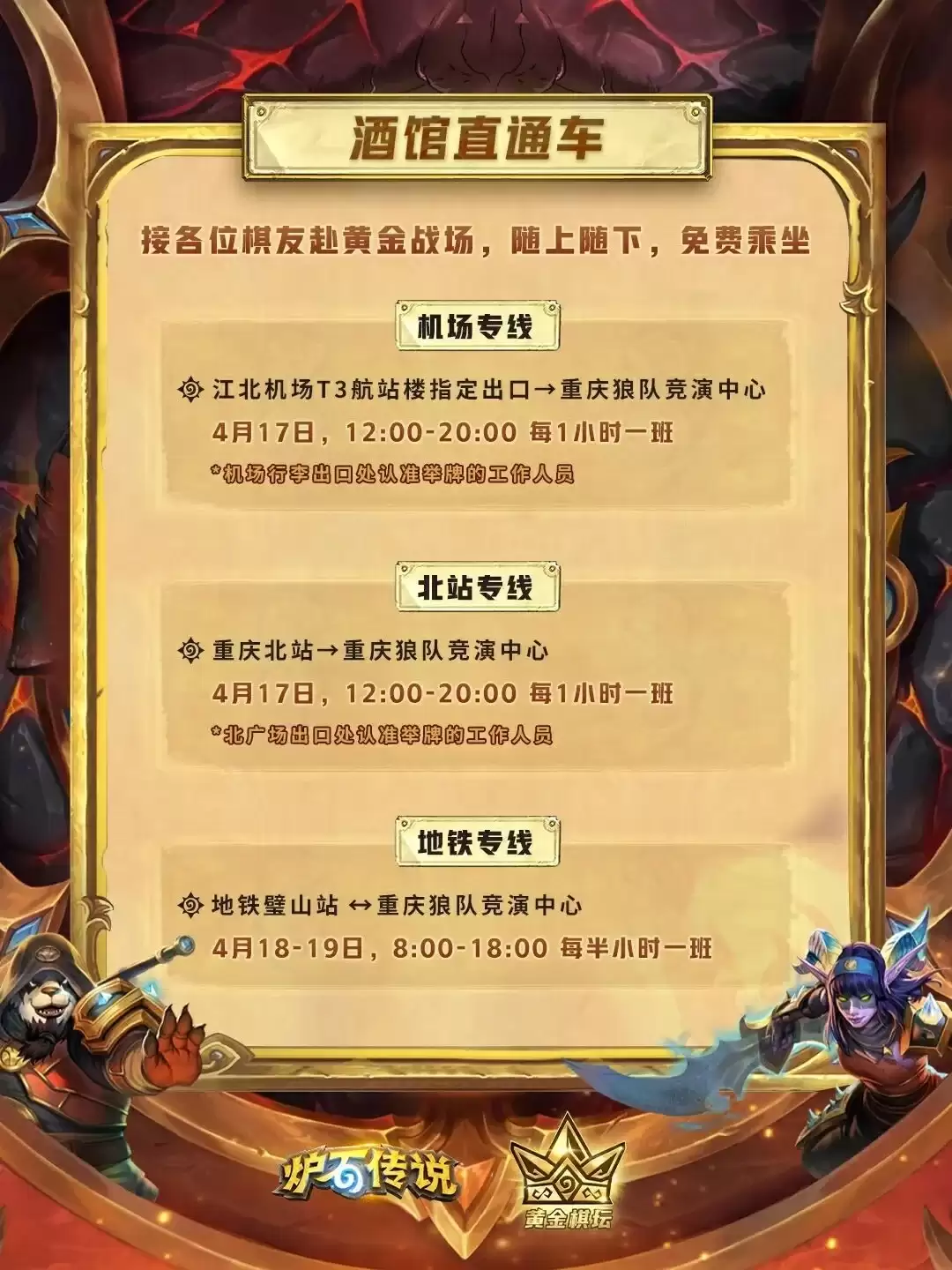 为了方便各位玩家抵达场馆,官方贴心准备了往返于机场、火车站及地铁站的接驳巴士,全程免费乘坐。具体的班次时间与乘车地点,可以参考下图信息。