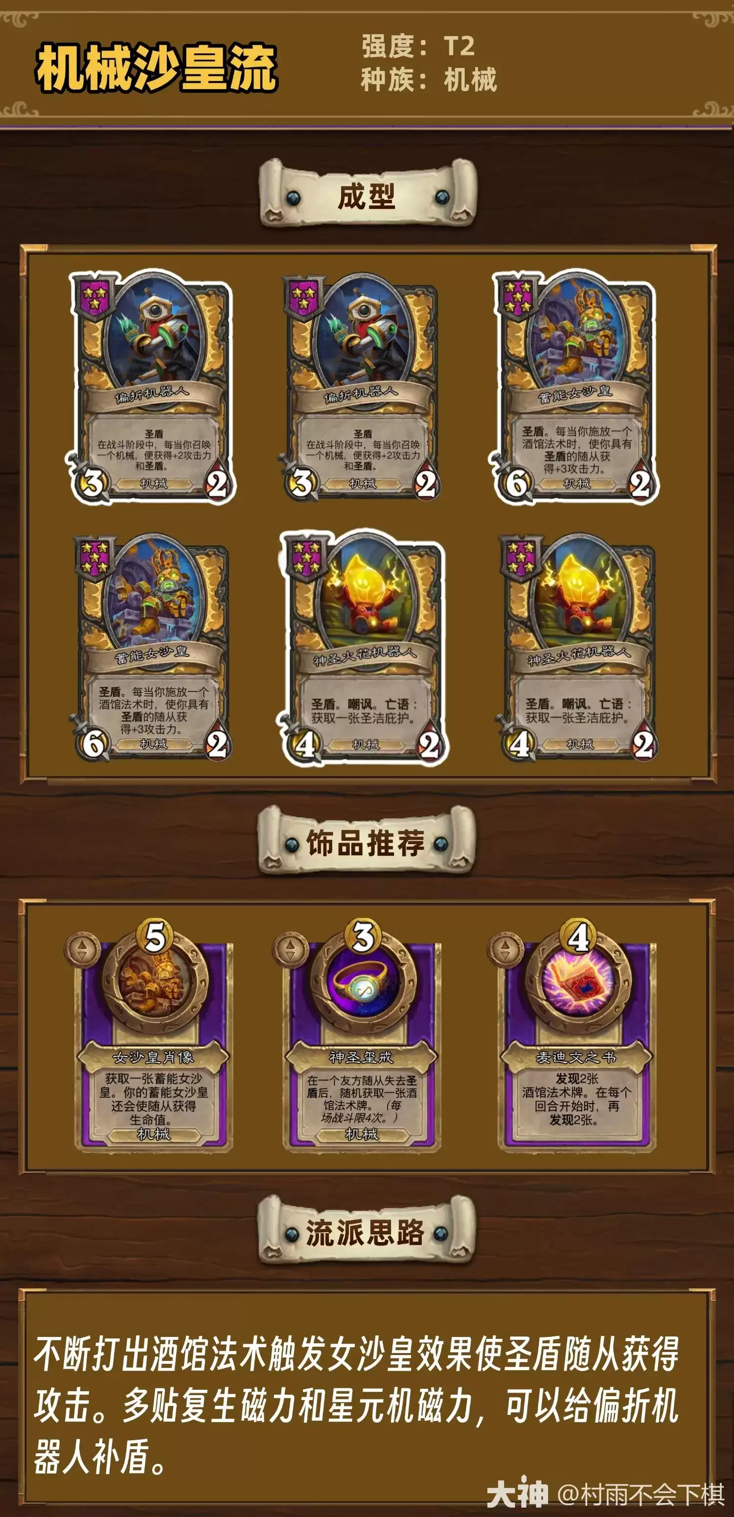 毫无疑问,阵容的绝对灵魂是英雄“沙皇”。其技能效果——每当友方机械死亡时获得临时攻击力并触发额外收益——直接决定了整套体系的构筑方向。这意味着我们需要大量携带“亡语”或能通过“磁力”产生衍生机械的随从。