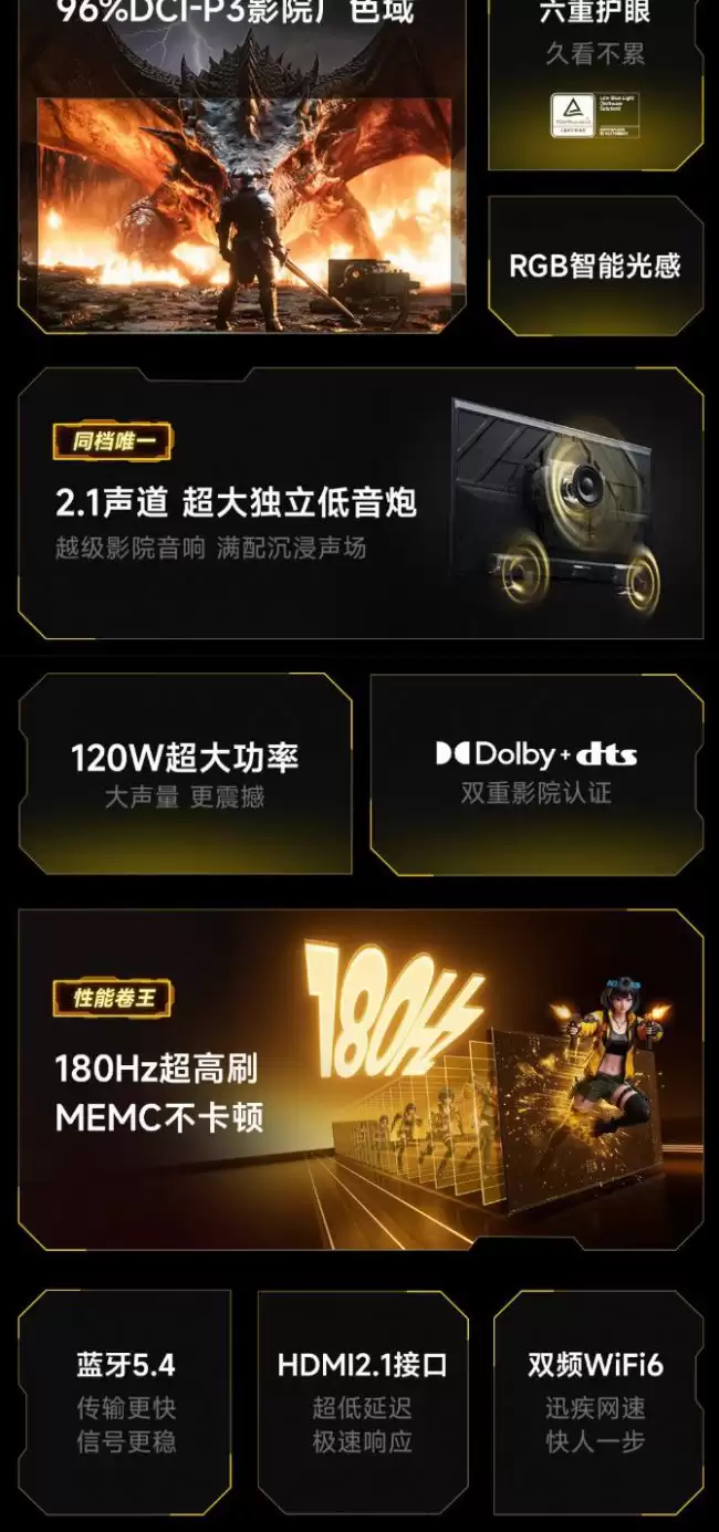 既然主打Mini LED,画质自然是核心卖点。这款小钢炮S Mini搭载了一块具备180Hz高刷新率的Mini LED面板,能够支持10-Bit色深,色彩表现覆盖了96%的DCI-P3广色域。为了应对复杂的环境光干扰,屏幕还特别加入了AG抗光层和LR低反射膜,官方标称的最高亮度可以达到600尼特。更贴心的是,电视内置了环境光传感器,能够根据观看环境自动调节屏幕的色温和亮度,这在同价位产品中算是一个实用的加分项。